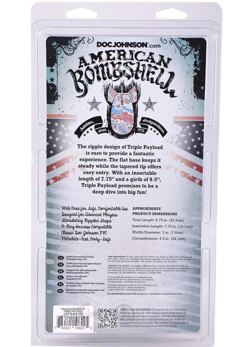 The ripple design of Triple Payload is sure to provide a fantastic experience. The flat base keeps it steady while the tapered tip offers easy entry. With an insertable length of 7.75” and a girth of 9.5”, Triple Payload promises to be a deep dive into big fun!