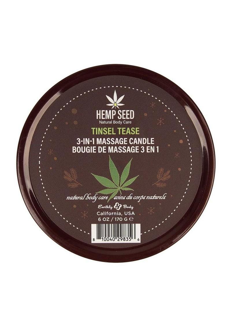 Tinsel Tease, a Limited Edition 3-in-1 Massage Candle, heats up winter massages with a lively blend of Honey, Warm Embers and Amber. Specially formulated to melt a couple degrees above body temperature, our 3-in-1 massage candles don’t just provide romantic light and fragrance – they melt into a decadent blend of natural oils that can be used as a moisturizer or for a warm massage. Hemp seed oil, the primary ingredient in these candles, has a fantastic slip factor for massage and, because it absorbs to the lipid layer of the cells, skin is left soft and moisturized, not greasy or goopy. Our holiday Candle Pre-Pack comes with an assorment of our limited edition holiday candles as well as a counter display and tester. 6oz. Vegan. THC-Free