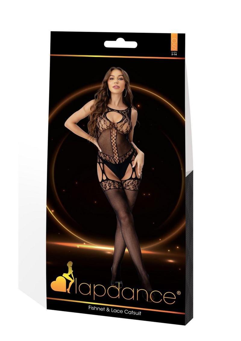 The Lapdance Lingerie fishnet and lace catsuit is an irresistibly sultry one-piece crafted from a sleek blend of nylon and spandex for a flawless, curve-hugging fit.