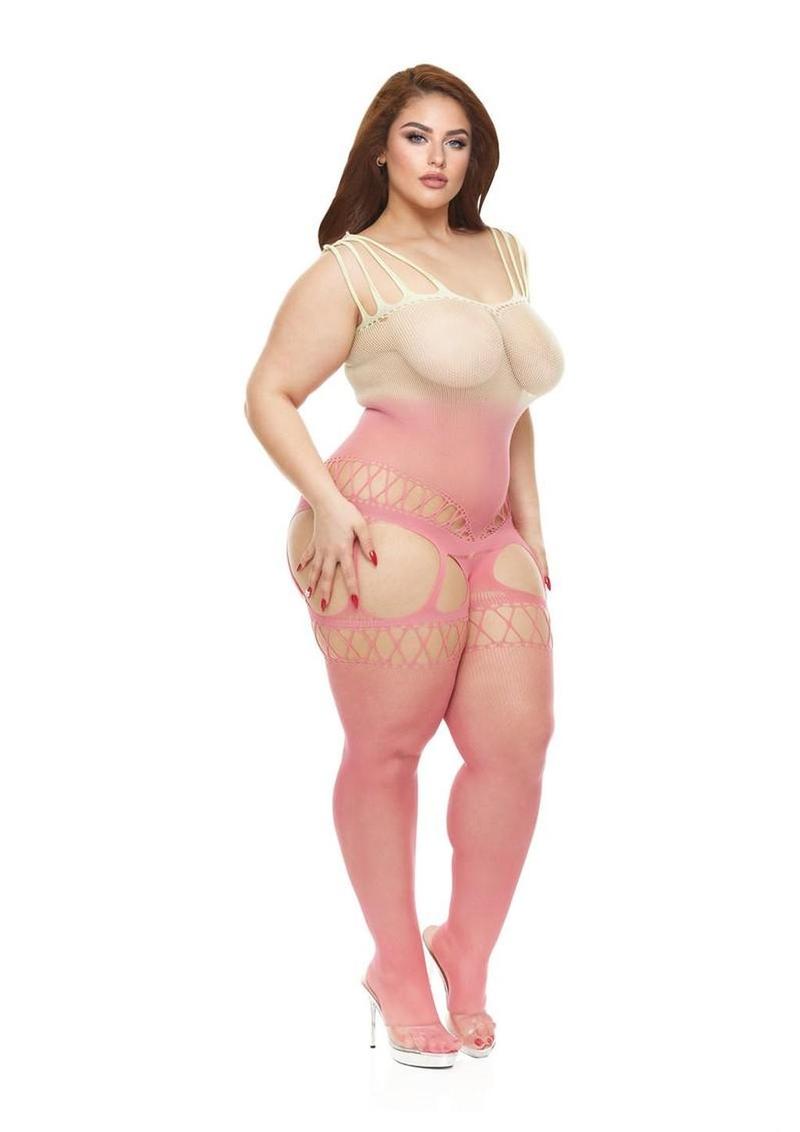 Design: This seamless one-piece bodystocking features an enchanting ombré effect, transitioning from soft pastel yellow to a sensual pink, with an integrated suspender and garter look that teases and tantalizes. Details: Delicate shoulder straps add a flirty, strappy dimension, while the cut-out hips and open crotch design bring bold, confident energy to your boudoir wardrobe.