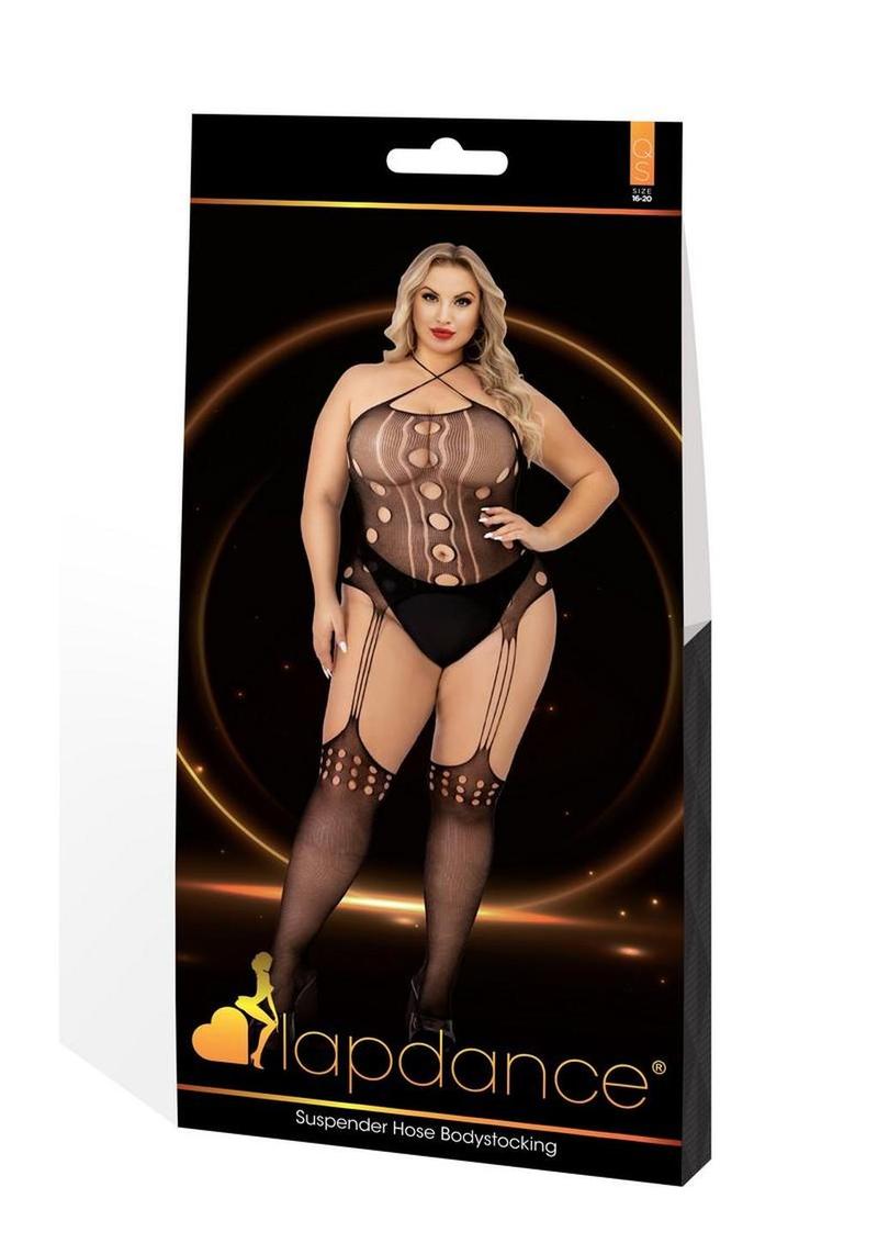 The Lapdance Lingerie Suspender Hose Bodystocking is a provocative one-piece crafted from a sleek blend of nylon and spandex, ensuring a comfortable yet form-fitting silhouette.