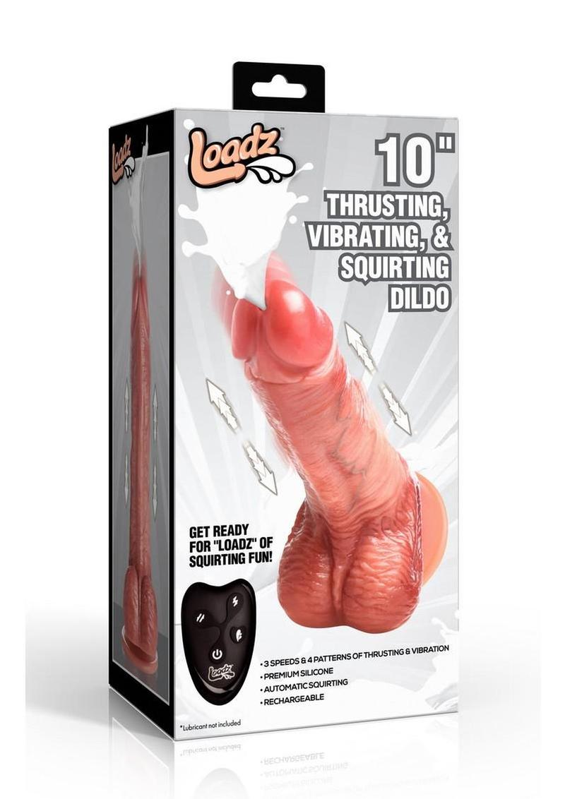 The Loadz 10″ Thrusting, Vibrating, and Squirting Dildo is a triple-function premium silicone toy featuring anatomically realistic surface detail, wireless remote operation, and an automatic fluid dispensing system. The dildo offers three speed settings and four combination patterns for its integrated thrusting and vibration motors. The automatic squirting function draws water-based lubricant from the included squeeze bottle through internal tubing and dispenses up to 20 mL from the tip, simulating ejaculation on demand. The heavy-duty suction cup base provides secure hands-free mounting on any smooth, nonporous surface. The unit is USB rechargeable with an IPX6 waterproof rating suitable for shower and bath use. Constructed from phthalate-free silicone with ABS plastic internal components.