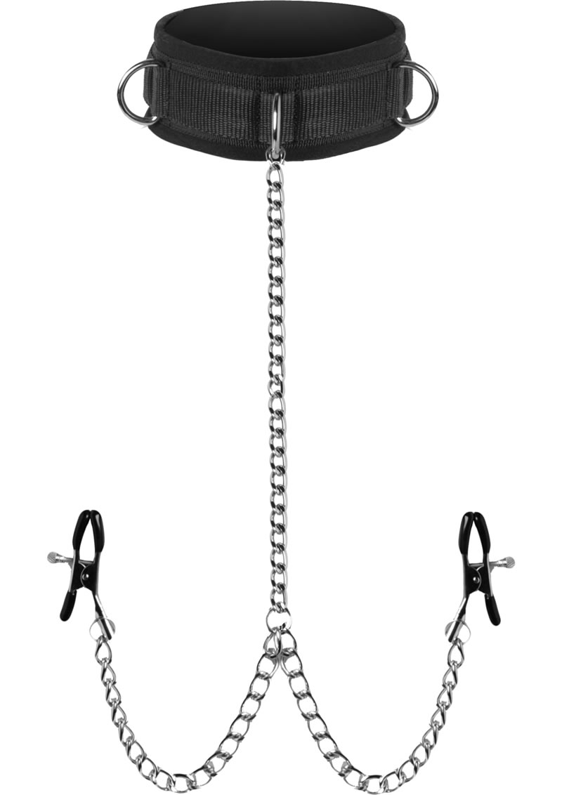 Imagine the seductive combination of collar and clamp, pleasure and pressure. Master Series has your fix with Submission Collar and Clamp Union. This two in one set is made with submission in mind. The quality collar is made more comfortable with the addition of a neoprene inner lining, and secures by means of a double Velcro binding. The collar has two extra D rings, if you want to add weights, rope, or any other accessory you can imagine. This duo features a 14 inch chain that splits in two at 8 inches, attaching to the collar at a front D ring. Each chain ends at an adjustable alligator style nipple clamp, easily made tighter with thumb screws. Each clamp has a vinyl tip for added comfort and better grip. Adorn the neck of your naughty one with this striking collar, as the chain dangles seductively against their chest.