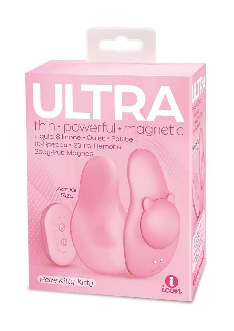 Presenting the smallest, thinnest silicone panty vibe ever made, “Ultra” from Icon. It’s ultra-thin, ultra-petite, ultra-powerful and it even has an ultra-strong kitty-shaped magnet! Its discreet remote hides in the palm of your hand and easily sends its 10-speed-signal across a room…and it’s all so whisper-quiet no one will know you’re buzzing except you and yours. There’s never been a panty vibe quite like it. Oh, and it’s ultra-cute to boot!